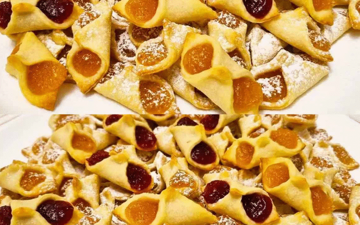 Нарізаю тісто на квадратики 4–5 см. На кожен вичавлюю повидло по діагоналі – від кутика до кутика. Один вільний кутик змащую водою й склеюю з протилежним, добре придавлюю пальцями.