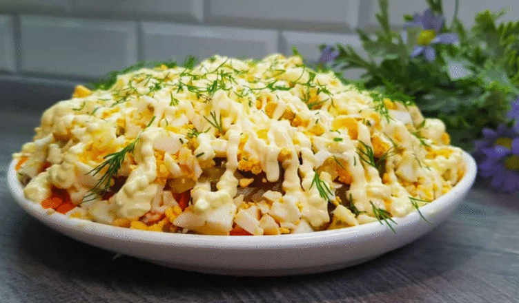 Беру плоску тарілку для подачі салату, його збираю одразу тут. Першим шаром викладаю консервну сардину, поливаю сіточкою із майонезу. Далі маринована цибуля, поливаю сіточкою із майонезу. Моркву натираю на терці, покриваю майонезом.