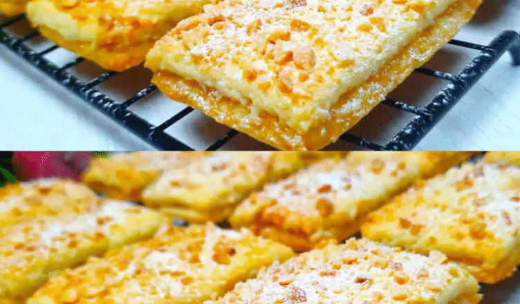 Тісто розкачую між двома аркушами пергаменту в прямокутний пласт 25 на 35 см. Розподіляю яблучну начинку. Накриваю другим шаром тіста і розрізаю на 32 прямокутники. Змащую яйцем і посипаю подрібненими горіхами.