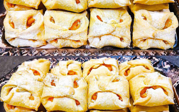 Перекладаю тісто на стіл, ділю навпіл, розкачую у квадратний пласт та тепер розрізаю на менші квадратики, викладаю начинку. Загортаю до центру усі чотири краї квадратика.