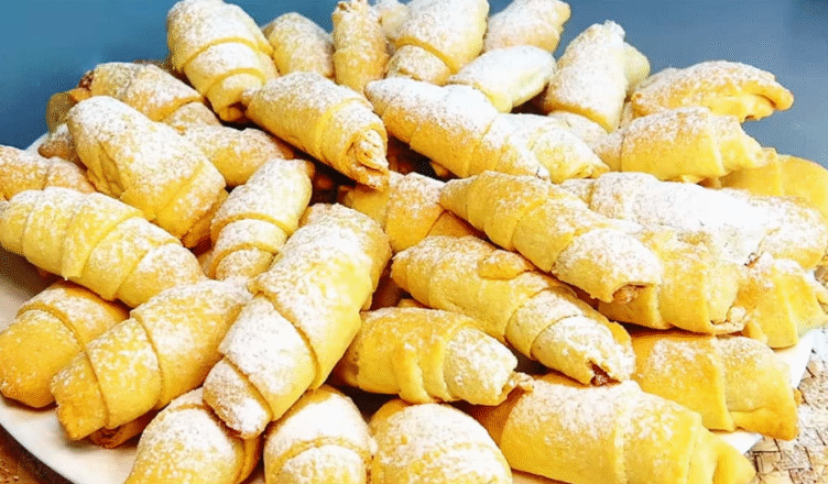 Коли дістаю з духовки — вони пахнуть неймовірно! Ніжні, крихкі, ніби пух. Даю трохи охолонути і щедро посипаю цукровою пудрою. Не шкодую — з нею вони виглядають як маленькі сніжки. Ось така гора смакоти виходить! Рогалики ніжні, хрусткі, у міру солодкі, з ароматною горіховою начинкою, що просто тане у роті.