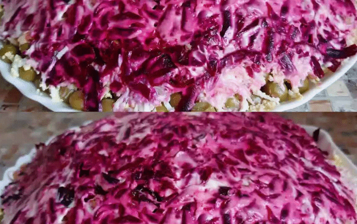 Останній шар — буряк. Беру варений буряк, натираю на терці й розподіляємо зверху. Змащую майонезом, щоб завершити салат. Залишаю його настоятися в холодильнику пару годин — тоді смак розкриється повністю, і можна подавати на стіл.