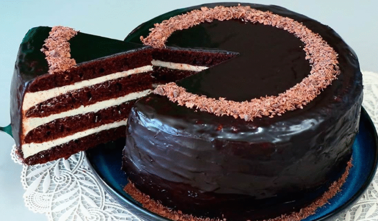 Дістаю торт із холодильника, знімаю плівку й обмазую боки відкладеним кремом. Потім заливаю глазур’ю — спочатку по краях, а далі по всій поверхні. Розрівнюю ложкою або лопаткою й посипаю тертим шоколадом. Ставлю торт у холодильник ще на 15 хвилин, щоб глазур застигла.