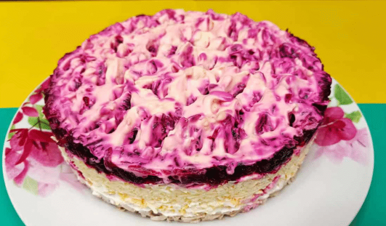 Натираю на терці варений буряк Змішую в окремій мисці видавлений часник з майонезом. Покриваю салат, смачного!