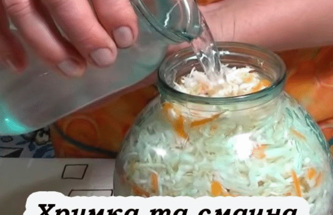 - Закип’ятіть воду з сіллю та оцтом і залийте капусту.