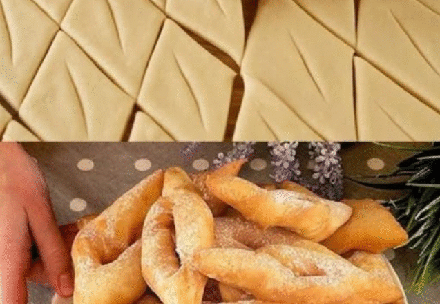 • Наріжте тісто на прямокутники та зробіть проріз у центрі кожного прямокутника. Протягніть один край тіста через проріз, щоб отримати класичну форму хмизу.