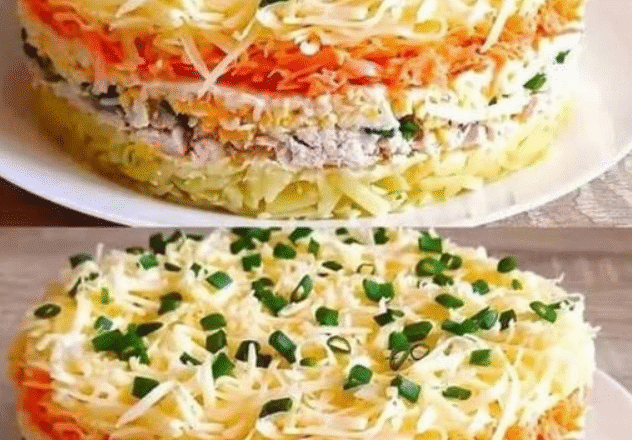 Далі на наступний шар нарізаю дрібно зелену цибулю. Тоді натираю на терці яйця та покриваю майонезом. Моркву натираю на терці і змішую в окремій мисці з майонезом та видавленим часником. Викладаю далі у форму, розрівнюю.