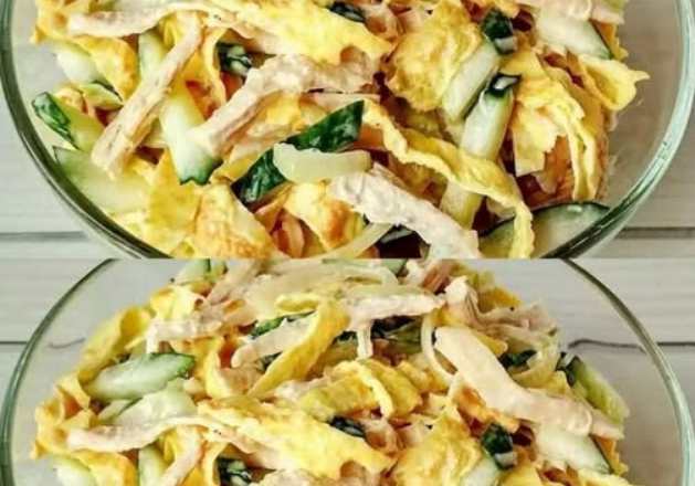 Нарізаю тонкими брусками свіжий огірок. Викладаю огірки та яєчну соломку у салатник. Відварену курячу грудку ділю на волокна. Нарізаю півкільцями цибулю, обсмажую в олії на сковороді до золотистості. Додаю цибулю, заправляю салат майонезом і перемішую.