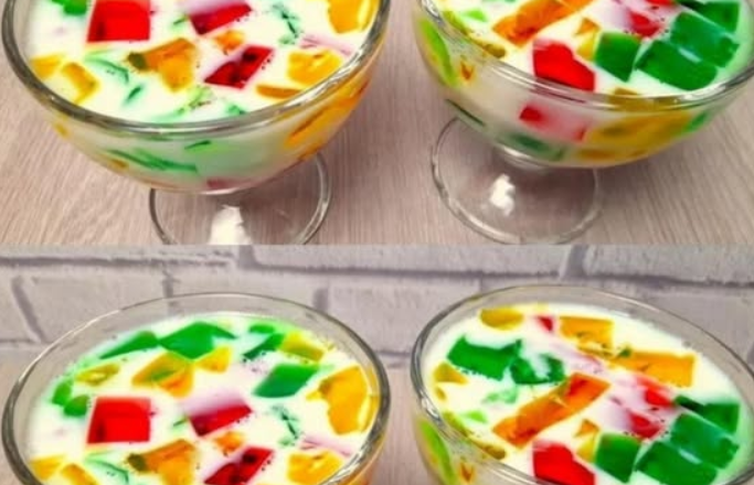 Яскраві шматочки желе, залиті ніжною молочною масою, виглядають ефектно, а смак