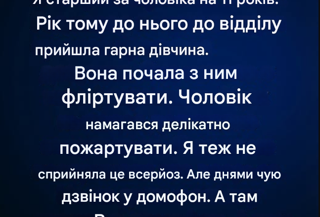 Чоловік делікатно намагався відбутися жартами, і я теж не сприймала це всерйоз. Наші стосунки завжди будувалися на чесності та сміху — це змушувало людей забувати про нашу різницю у віці. Але днями я почула дзвінок домофону.