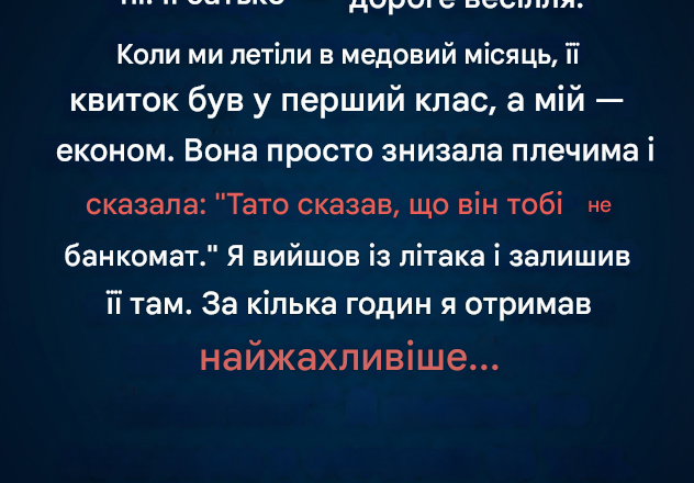 Коли ми сіли в літак для медового місяця, моя дружина летіла першим класом, а мій квиток був у економ-класі.