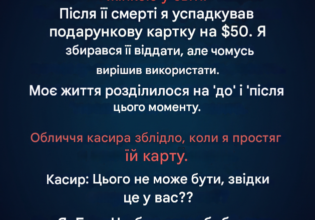 Коли моя бабуся померла, я думав, що єдине, що вона залишила мені, — це скромна подарункова карта на 50 доларів. Це навряд чи той спадок, про який мрієш, але ідеально підходив жінці, відомої своєю ощадливістю. Я й гадки не мав, що ця маленька карта відкриє таємне життя, яке вона приховувала від усіх нас.