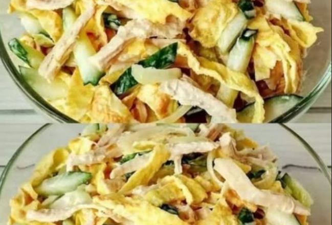 Нарізаю тонкими брусками свіжий огірок. Викладаю огірки та яєчну соломку у салатник. Відварену курячу грудку ділю на волокна. Нарізаю півкільцями цибулю, обсмажую в олії на сковороді до золотистості. Додаю цибулю, заправляю салат майонезом і перемішую.