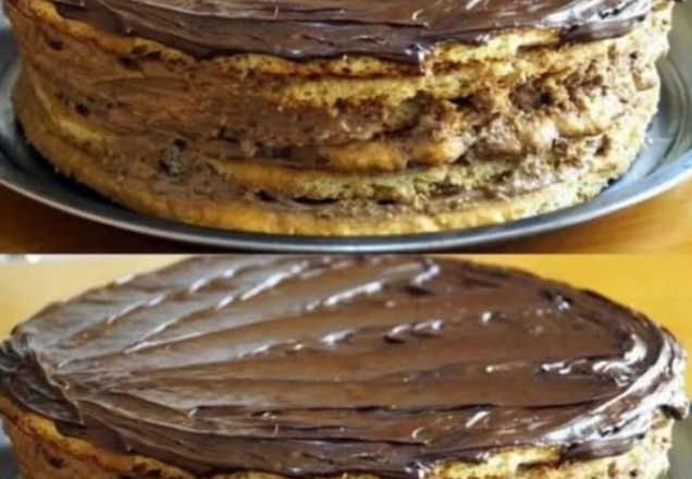 Збираю тортик, змащую усі коржики кремом. Прикрашаю розтопленим шоколадом, смачного!