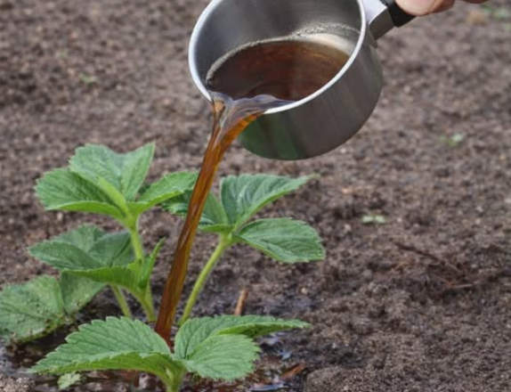 Під кожен кущик полуниці виливаю по одному ковшику такого розчину — приблизно 300–400 мл.