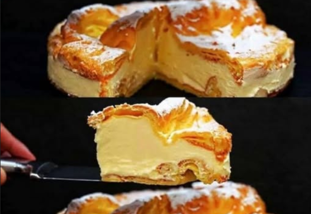 Перед подачею присипаю торт цукровою пудрою. Нарізаю порційними шматочками — вони виходять м’які, ніжні, крем буквально тане в роті. Цей торт дуже простий у приготуванні, а смак просто неймовірний. М’яке заварне тісто та ніжний крем роблять його схожим на великий еклер, тільки ще смачніший!