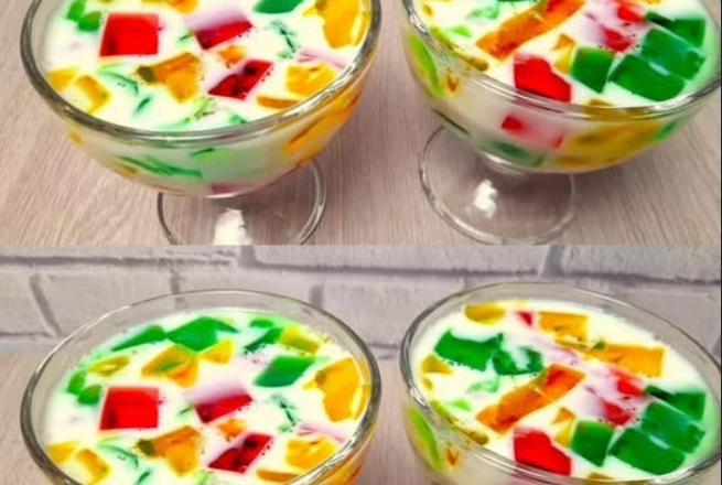 Яскраві шматочки желе, залиті ніжною молочною масою, виглядають ефектно, а смак