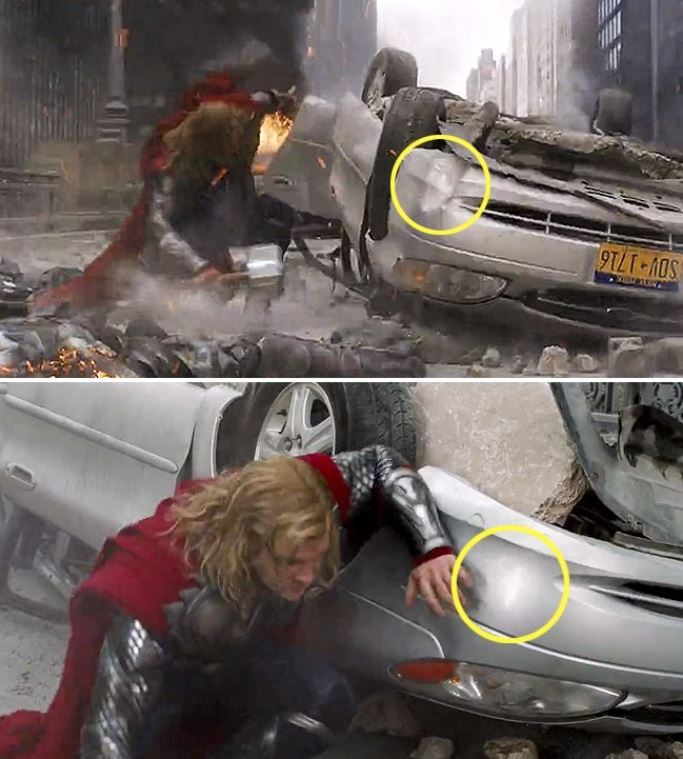 «Месники». Частина 1. Все розвалюється, уламки та пил розлітаються всюди, включаючи пом’ятий автомобіль, бампер якого раптово ремонтують у сцені з Тором. Це диво, нічого більше.