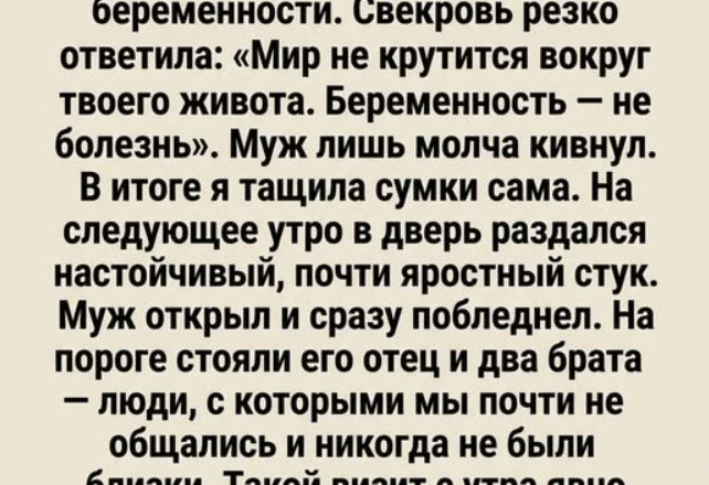 Я була на восьмому місяці вагітності, коли напруга в сім’ї нарешті досягла своєї межі. Одне різке слово, байдуже мовчання чоловіка і нескінченна ніч, протягом якої я все гостріше відчувала себе чужою у власному домі. На ранок цю гнітючу тишу порушив наполегливий стукіт у двері. На порозі стояв мій свекор.