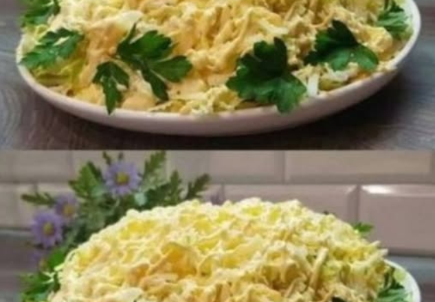 Капусту шаткую, викладаю на салат, поливаю майонезом. На останній шар салату натираю твердий сир на терці, прикрашаю зеленню!